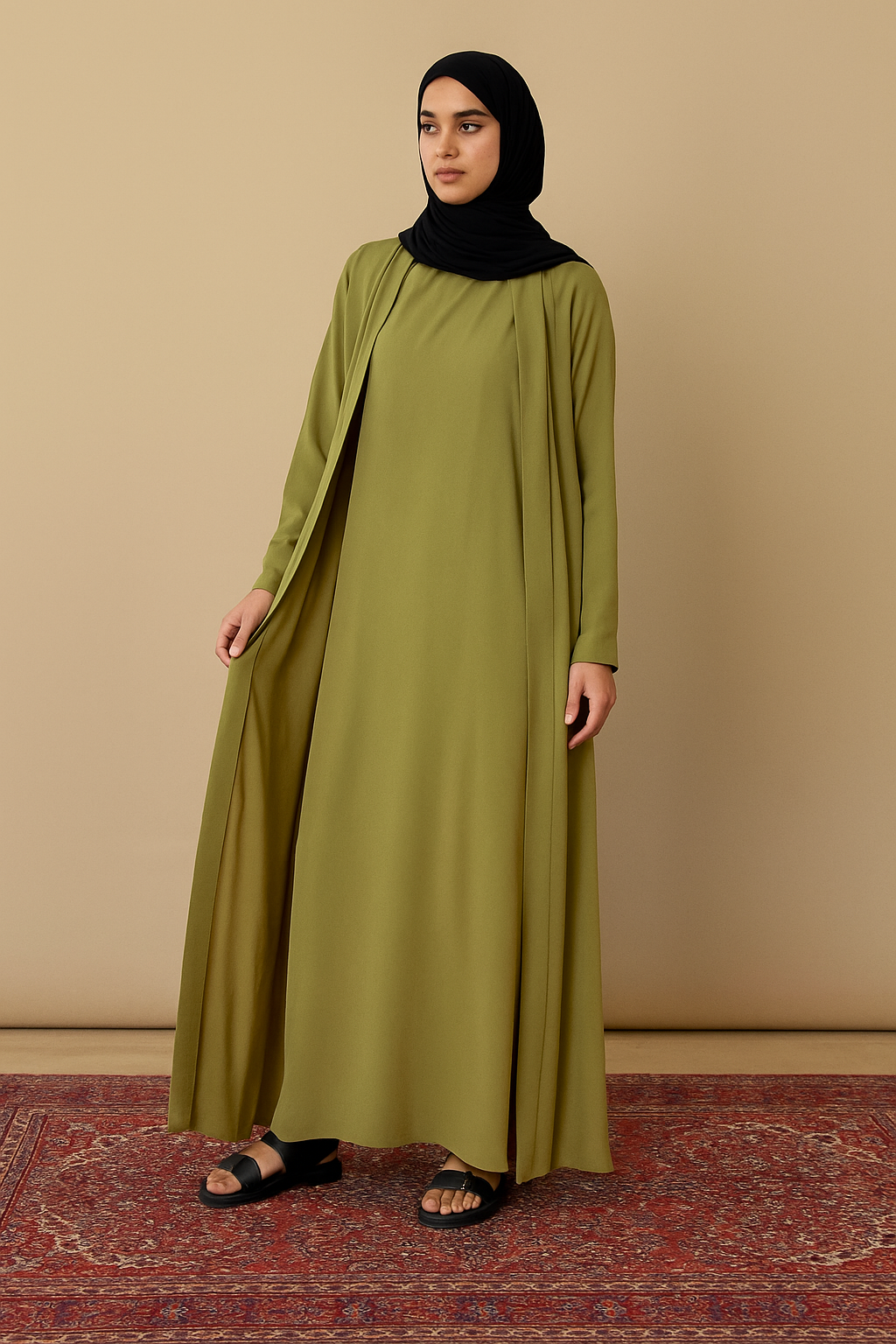 Ensemble composé d'une sous-robe droite et d'un gilet/kimono très évasé. Beau tissu de très belle qualité totalement opaque, frais, léger et doux au touché (aerobin).
